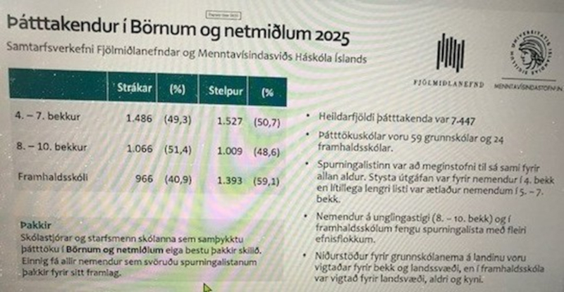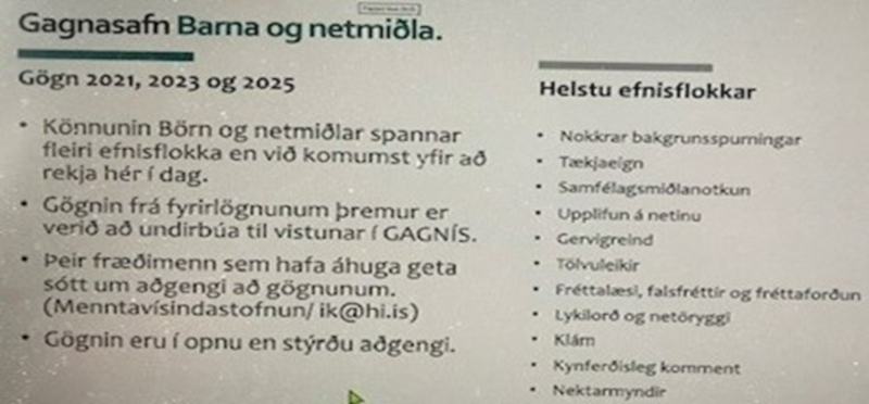 Ingibjörg Kjartansdóttir, verkefnastjóri hjá Menntavísindasviði Háskóla Íslands, sagði frá helstu niðustöðum könnunar sem lögð var fyrir skólabörn frá og með fjórða bekk og upp að 18 ára aldri. Könnunin hefur verið lögð fyrir börn í þessum bekkjum á tveggja ára fresti síðan 2021, og sumar spurningar halda sér en öðrum skipt út. Spurningapakkinn er um ár í undirbúningi, því vandað er til verka og hugað að aldri svarenda. Þátttaka var um 50% í yngri aldursflokkum en nær 60% í framhaldsskólahópnum.