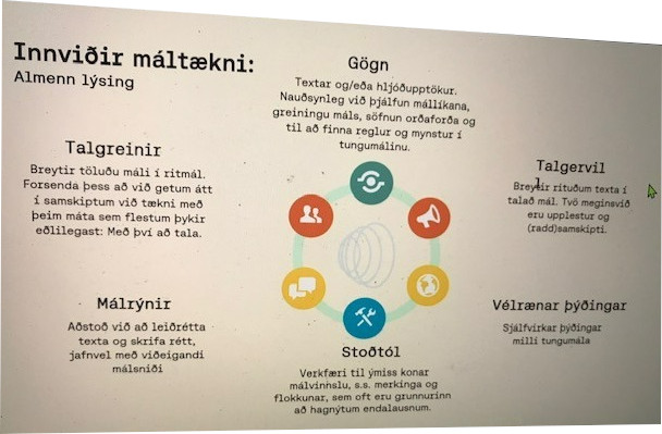 Óttar Kolbeinsson Proppé, yfirmaður stefnusamhæfingar og alþjóðamála hjá Almannarómi, sagði frá verkefninu Glóð, sem hlaut nýlega styrk, 1,4 milljarða króna. Almannarómur, miðstöð máltækni, https://almannaromur.is/ hóf störf 2014 og var hlutverkið að verkstýra máltækniáætlun stjórnvalda, annars vegar að tryggja stafræna framtíð íslenskrar tungu og líka að hægt verði að nota nýjustu tækni á íslensku. Um tveir tugir skóla, félagasamtaka, stofnana og fyrirtækja eiga Almannaróm, þannig að samvinnan er víðtæk. Innviðum máltækni var skipt upp í 6 þætti, sjá mynd 1. Efni Almannaróms er gefið út opið, þannig að hver sem er getur nýtt sér gögnin og hagnýtu lausnirnar. Nýja verkefnið Glóð tengir Ísland við LUMI (Large Unified Modern Infrastructure ), https://lumi-supercomputer.eu/, eina stærstu ofurtölvu í heimi.