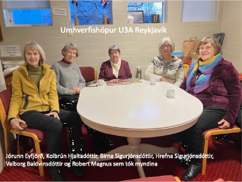 Umhverfishópurinn var stofnaður á fundi félagsmanna 12. maí 2022. Á fundinum varð til stýrihópur og í honum eru nú: Birna Sigurjónsdóttir, Hrefna Sigurjónsdóttir, Jórunn Eyfjörð, Kolbrún Hjaltadóttir, Robert Magnus og Valborg E. Baldvinsdóttir. Stýrihópurinn skipuleggur fundi og aðra viðburði hópsins sem eru opnir öllum félagsmönnum U3A Reykjavík.